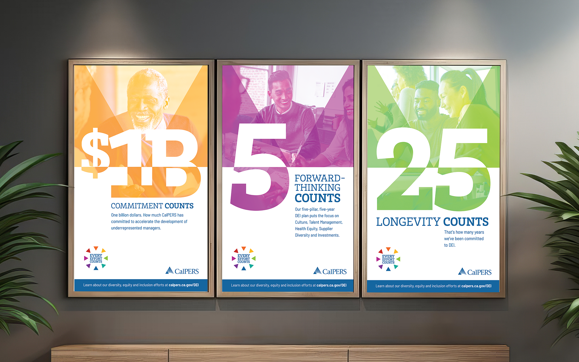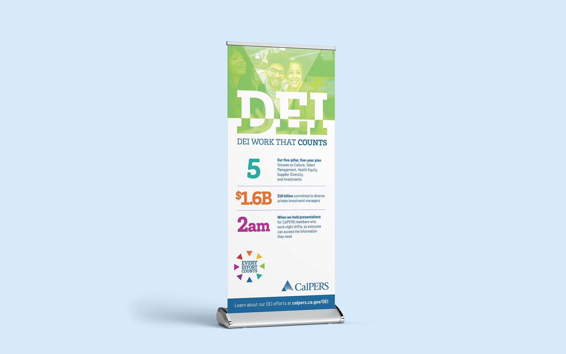 CalPERS asked the agency I worked for to come up with ideas for their diversity, equity and inclusion (DEI) efforts. I teamed up with a smart copywriter and we came up with the “Every Effort Counts” campaign idea, which included a campaign logo, posters, an annual report, a pull-up banner and conference booth.