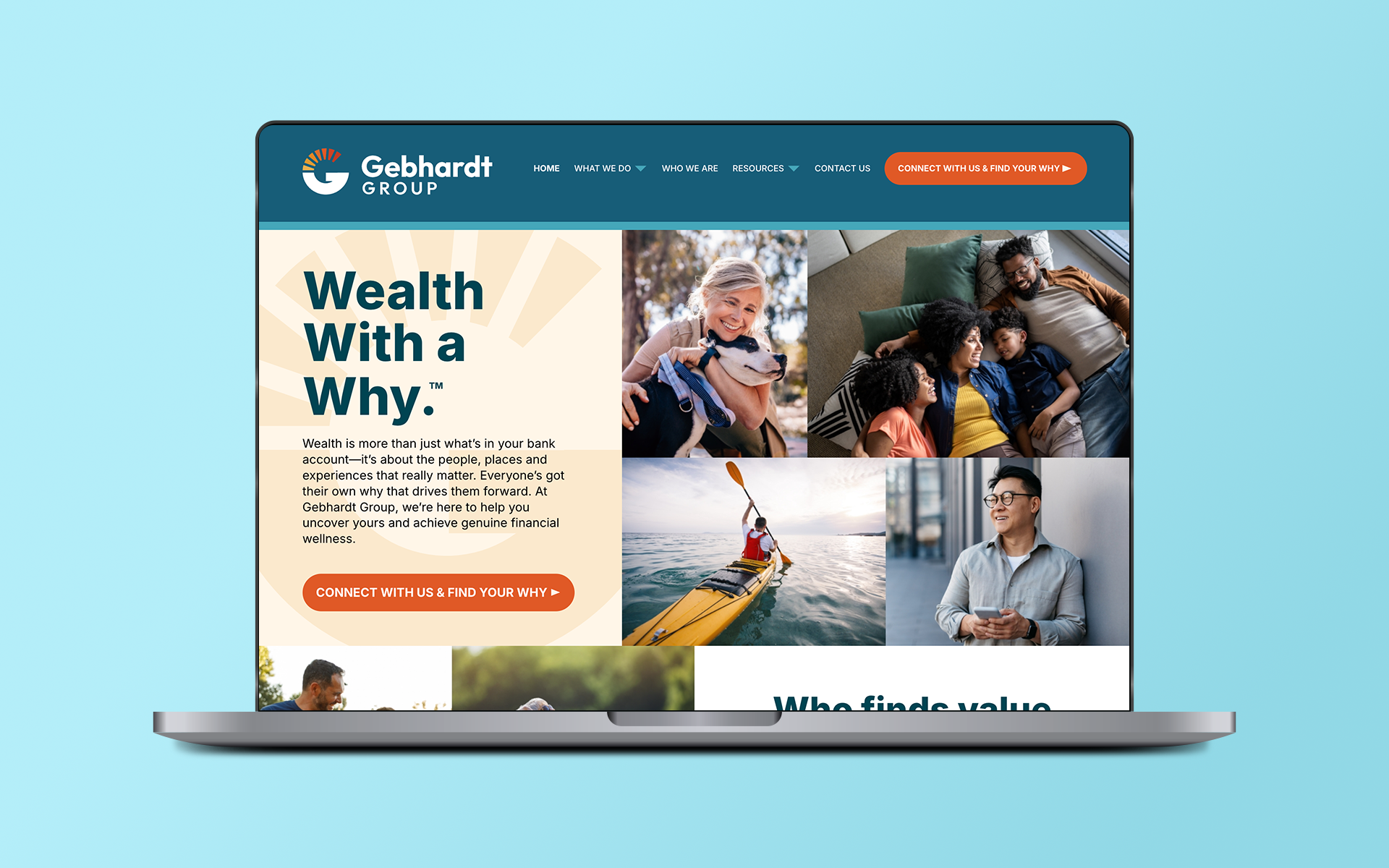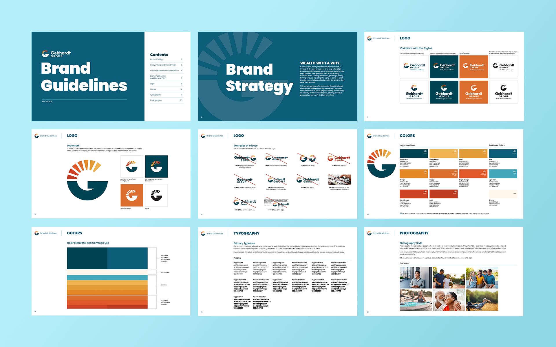 Working with The Gebhardt Group, I was able to help update their branding with a new logo, brand guidelines and website. The sunray-inspired steps moving to form the shape of the G mark and the expanded vibrant color palette in the logo help convey their positive messaging about helping people discover financial wellness for a better future.
